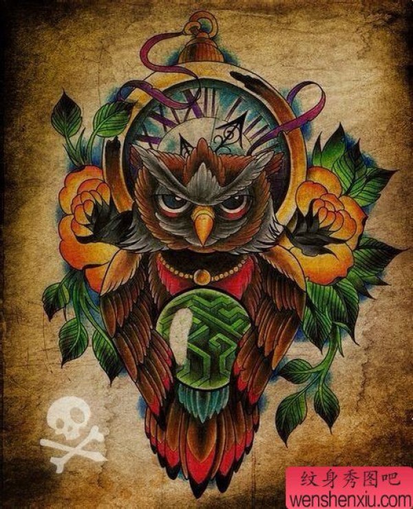 一张时尚很酷的猫头鹰纹身手稿