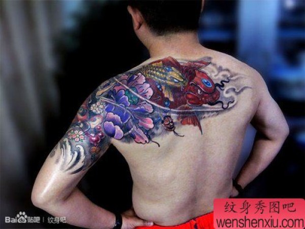 男生肩膀处很酷的鲤鱼莲花纹身图案