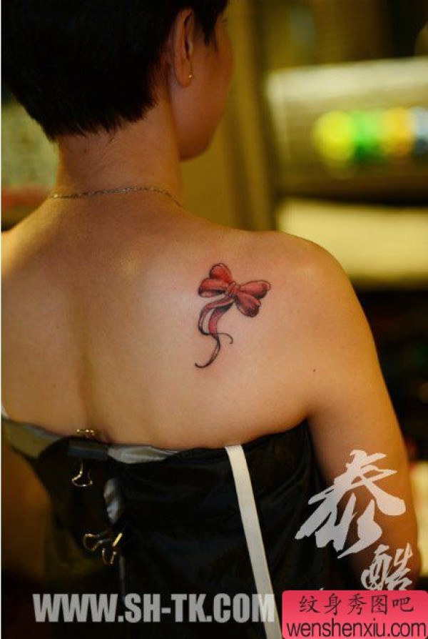 女生肩膀处小巧时尚的蝴蝶结纹身图案