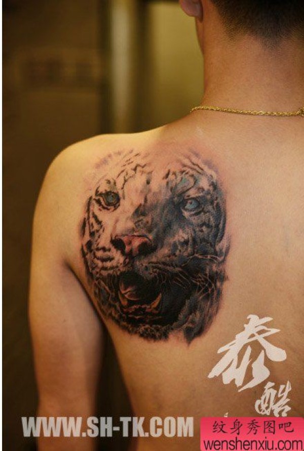 男生后肩背时尚很酷的虎头纹身图案