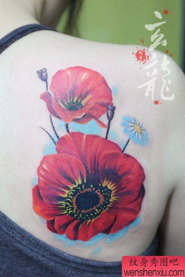美女肩背唯美漂亮的彩色花卉纹身图案