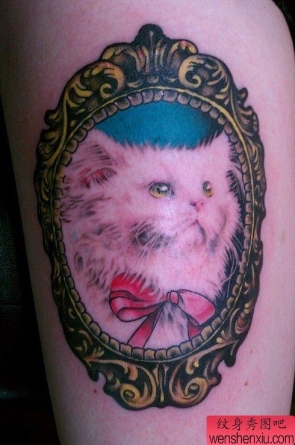 女生腿部呆呆的一张猫咪纹身图案