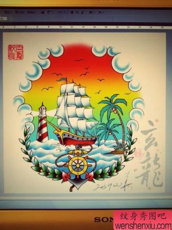 一张很酷时尚的帆船灯塔纹身手稿