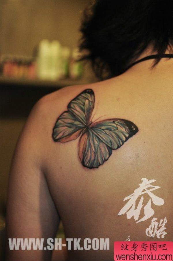 女生肩背唯美时尚的彩色蝴蝶纹身图案