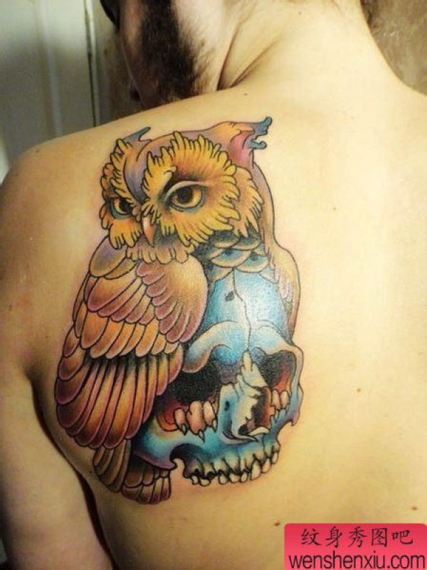 女生肩背时尚很酷的猫头鹰纹身图案