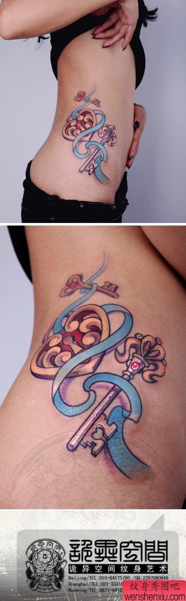 美女腰部时尚时尚的爱心锁与钥匙纹身图案