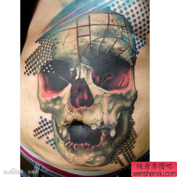 男生侧腰很酷帅气的欧美彩色骷髅纹身图案