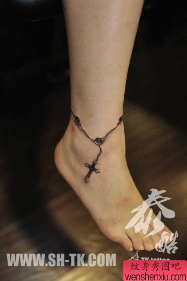 女生脚腕唯美小巧的十字架脚链纹身图案