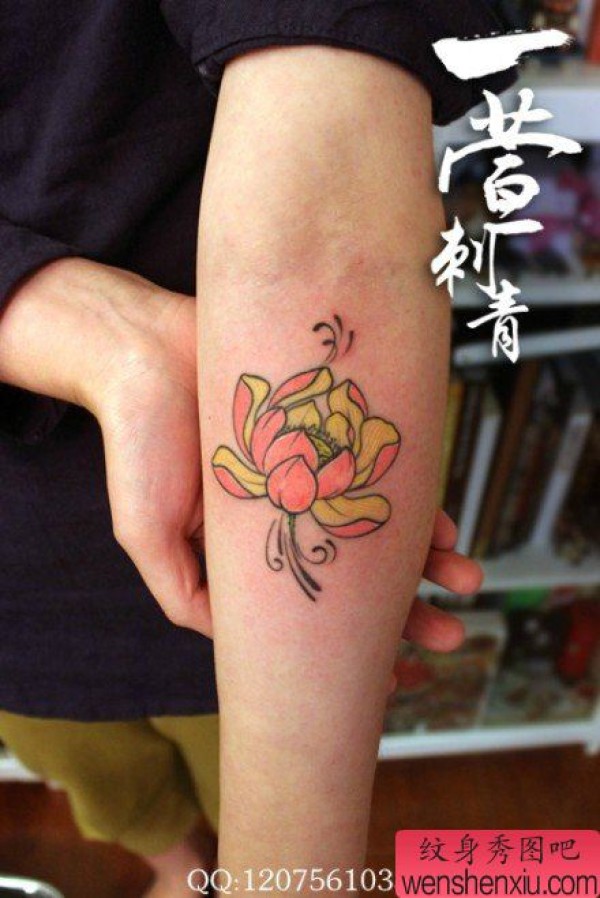 女生手臂唯美漂亮的彩色莲花纹身图案
