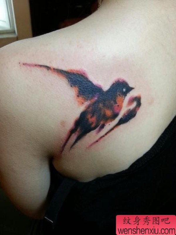 女生肩背唯美时尚的水墨小燕子纹身图案
