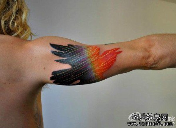 手臂时尚很酷的一张彩色图腾乌鸦纹身图案