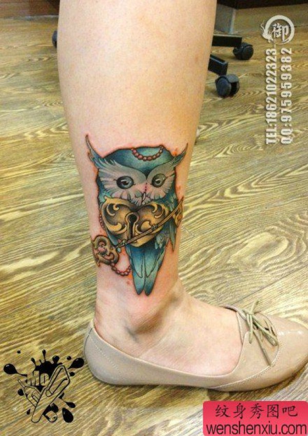 女生腿部时尚时尚的猫头鹰爱心锁钥匙纹身图案