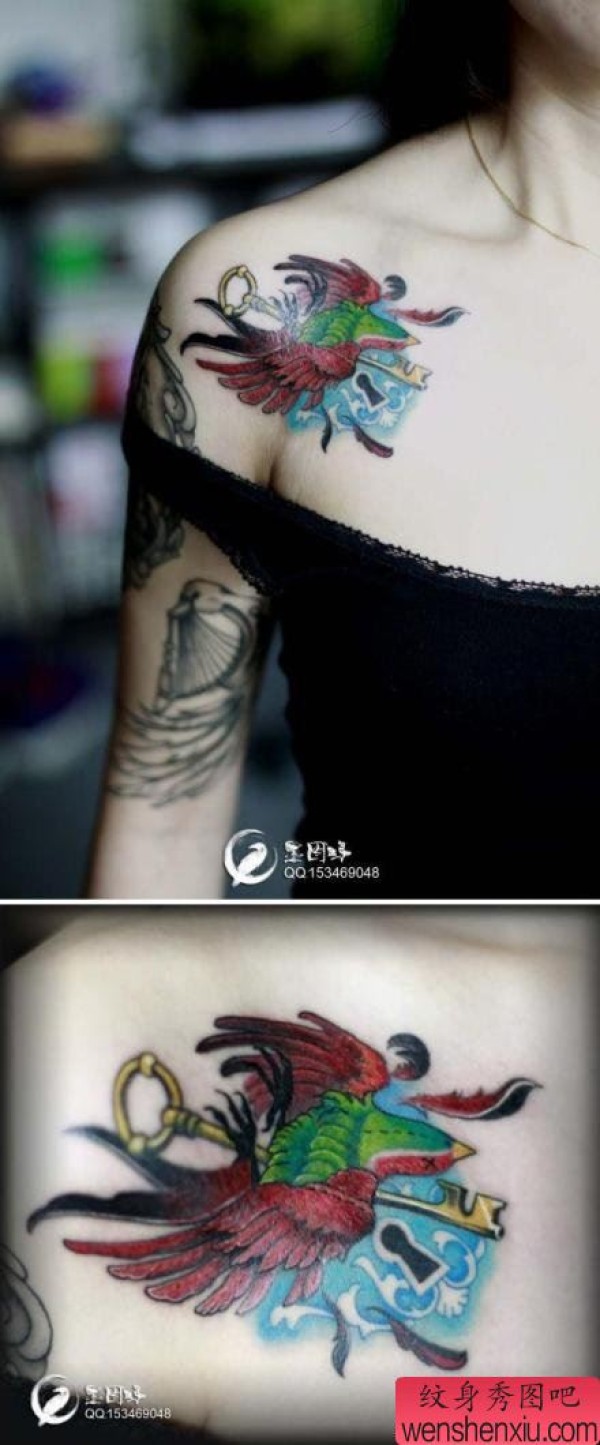 女生肩膀处时尚时尚的小燕子与钥匙纹身图案