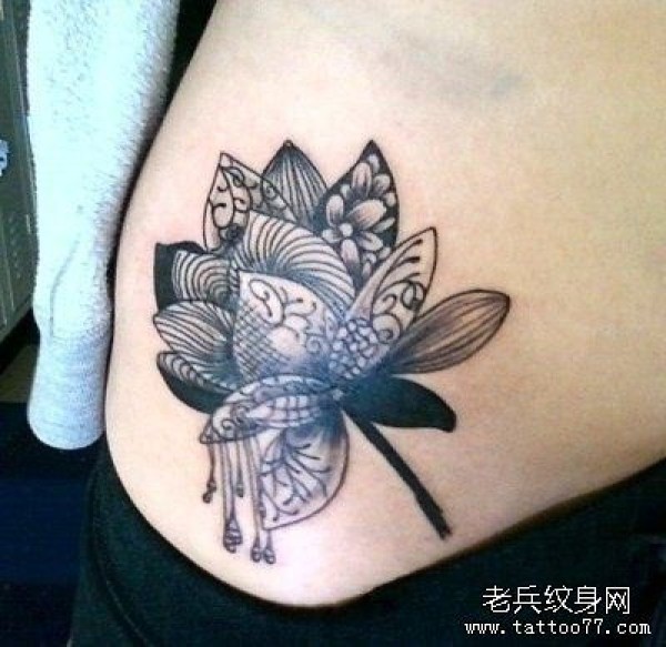 一张美女胯部唯美时尚的黑白莲花纹身图案