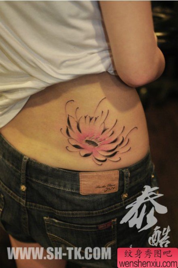 美女腰部时尚唯美的彩色莲花纹身图案