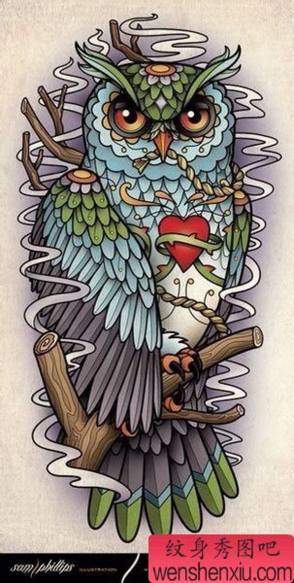 时尚很酷的一张彩色猫头鹰纹身手稿