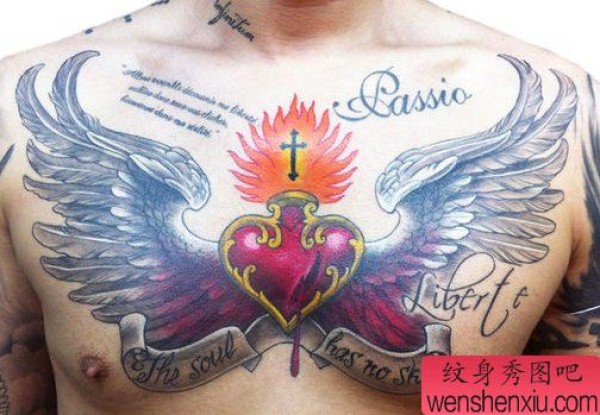 男士胸前超酷霸气的爱心翅膀纹身图案