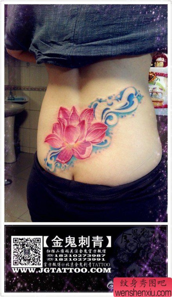 女生腰部时尚精美的彩色莲花纹身图案