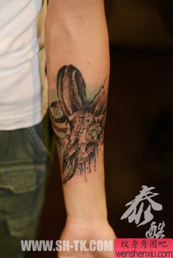 男生手臂时尚帅气的一张羊头骷髅纹身图案