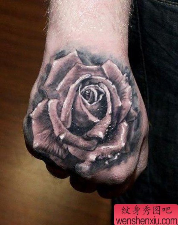 手背一张时尚经典的黑白玫瑰纹身图案