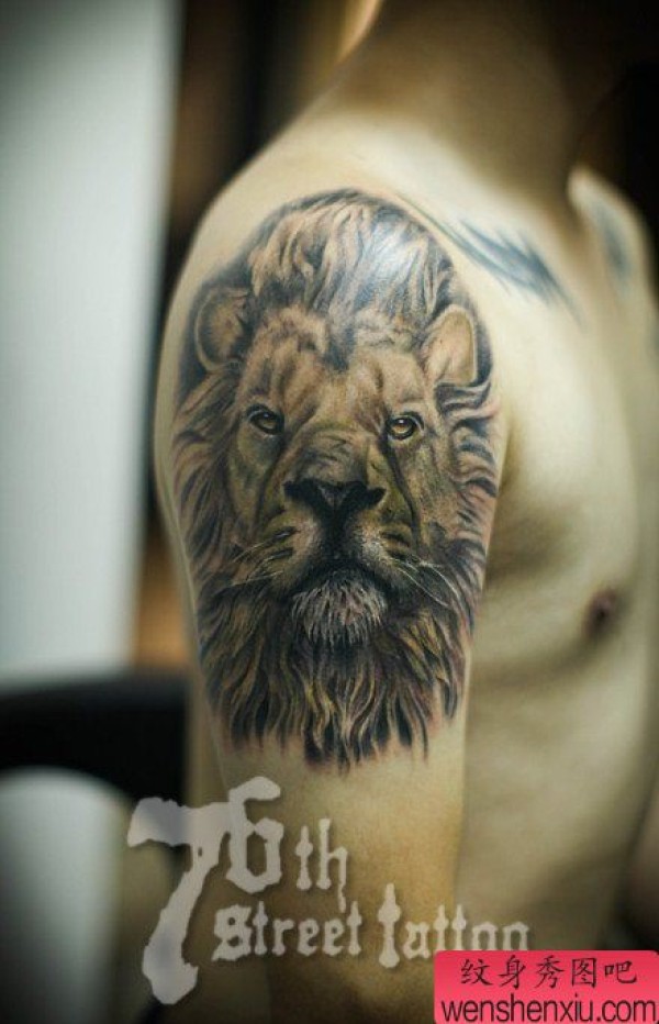 男生手臂经典时尚的彩色狮头纹身图案