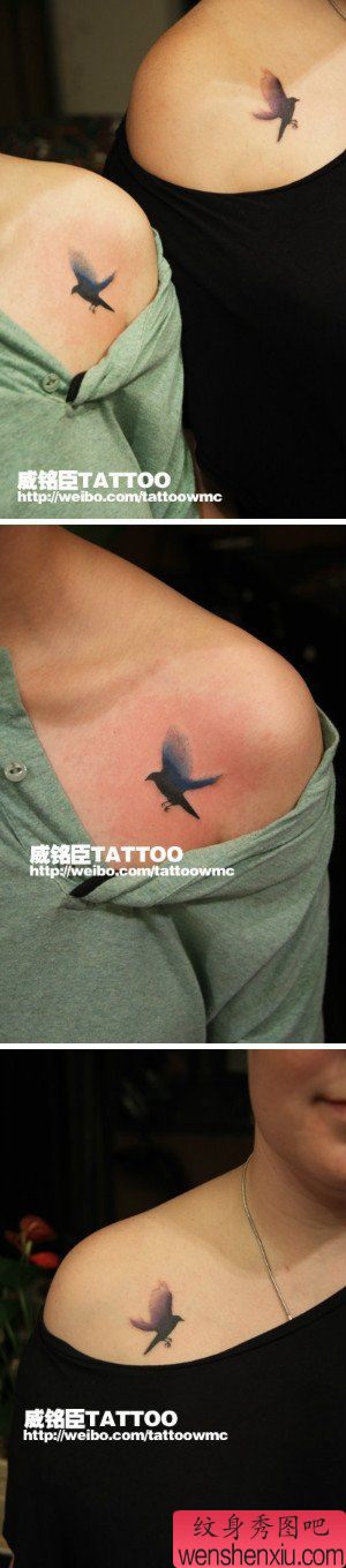 女生肩膀处小巧时尚的小鸽子纹身图案