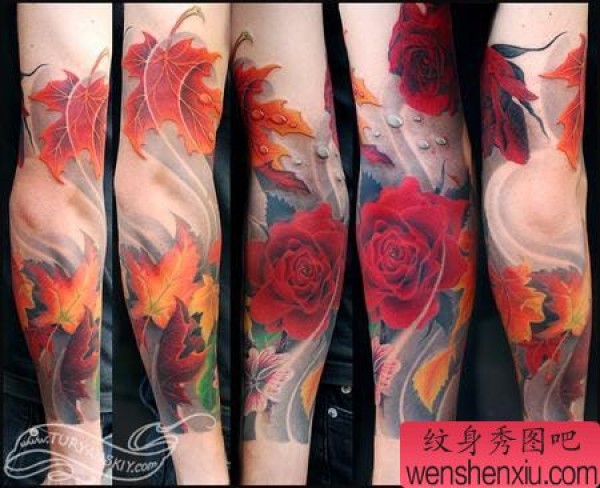 手臂时尚时尚的玫瑰与枫叶纹身图案
