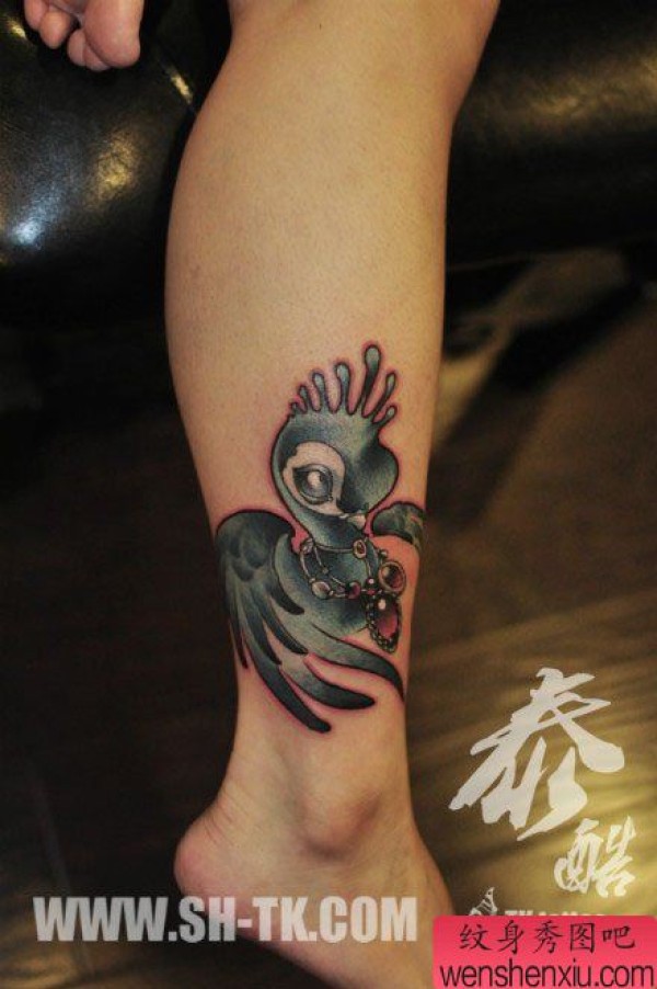 女生腿部时尚时尚的彩色小鸟纹身图案