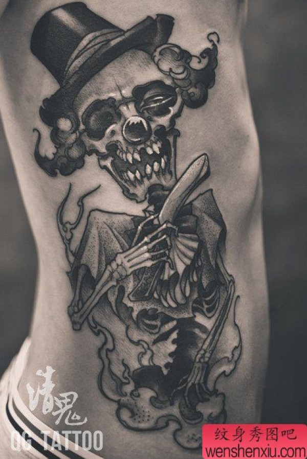 男生侧腰时尚很酷的小丑骷髅纹身图案
