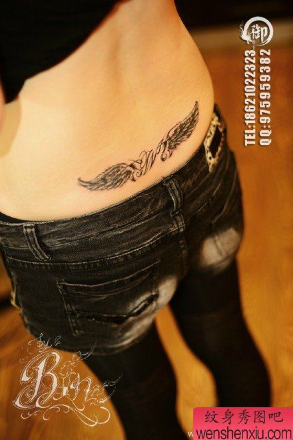 美女腰部唯美时尚的黑白小翅膀纹身图案