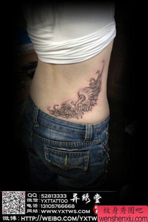 女生腰部时尚唯美的黑白翅膀纹身图案