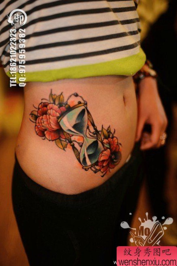 美女腹部时尚时尚的彩色沙漏纹身图案