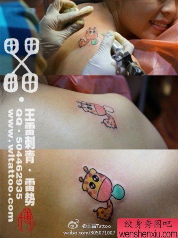 女生肩膀处超可爱很萌的小长颈鹿纹身图案