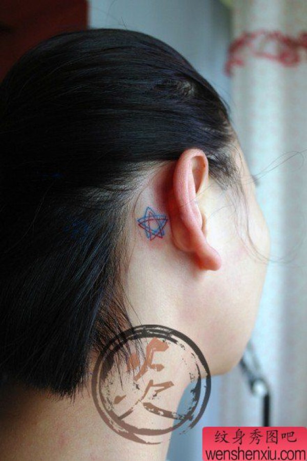 女生耳部一张小巧时尚的重影五角星纹身图案