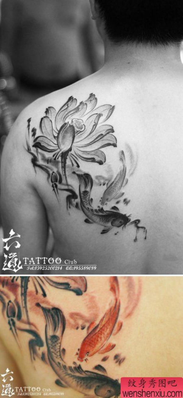 后肩背唯美时尚的写意水墨莲花鲤鱼纹身图案