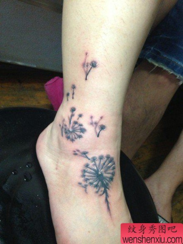 脚部时尚时尚的黑白蒲公英纹身图案