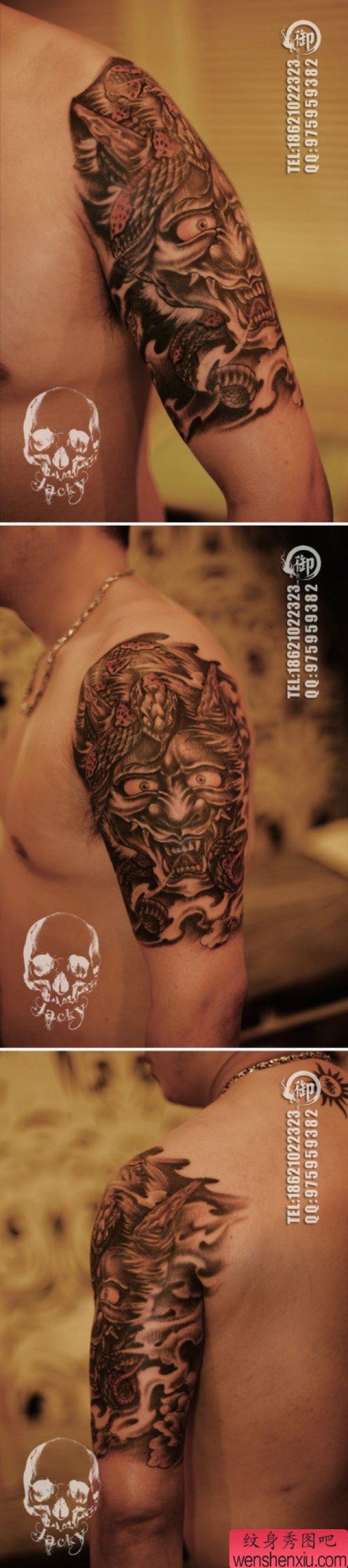 手臂超帅帅气的黑白般若与蛇纹身图案