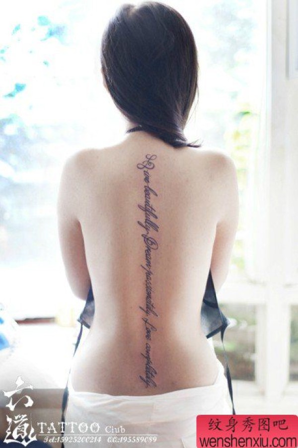 女生后背脊椎时尚时尚的花体字母纹身图案