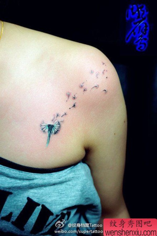 女生肩膀处小巧时尚的蒲公英纹身图案