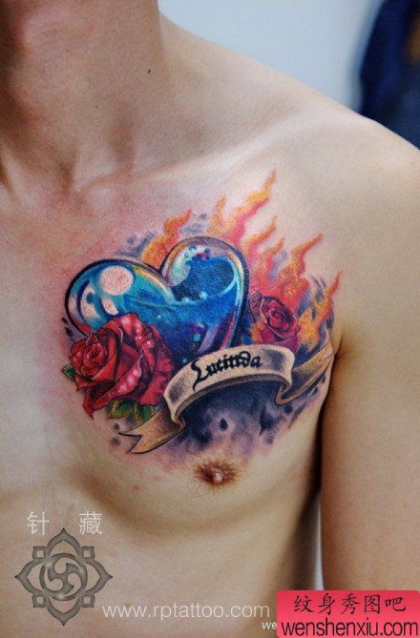 胸前经典很酷的彩色爱心玫瑰花纹身图案