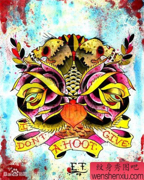 一张另类经典的猫头鹰玫瑰骷髅纹身手稿
