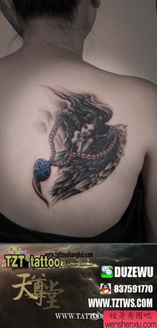 女生肩背时尚漂亮的天使纹身图案