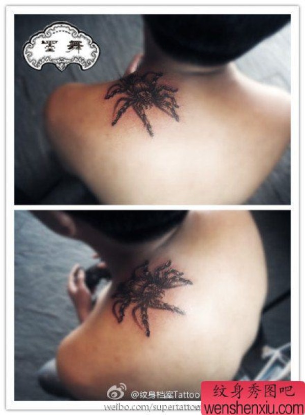 肩膀处精美时尚的黑白蜘蛛纹身图案