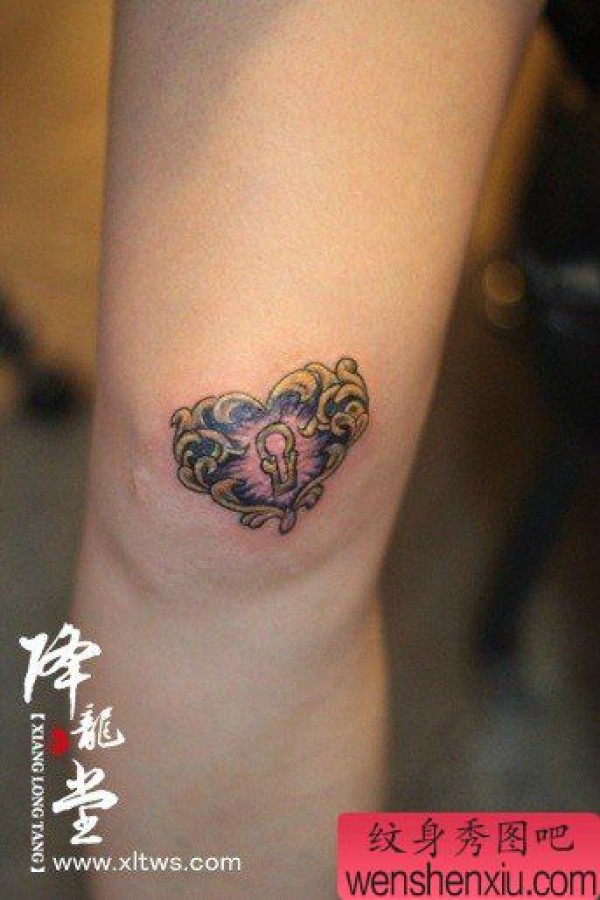 腿部一张时尚精美的爱心锁纹身图案