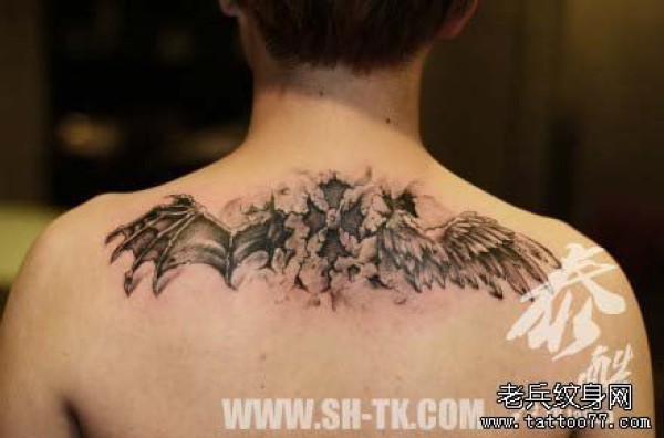 男生后背时尚的一半天使一半恶魔翅膀纹身图案