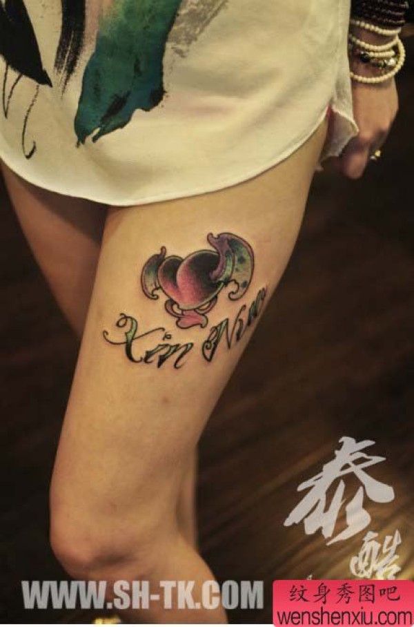 美女腿部小巧时尚的爱心翅膀纹身图案