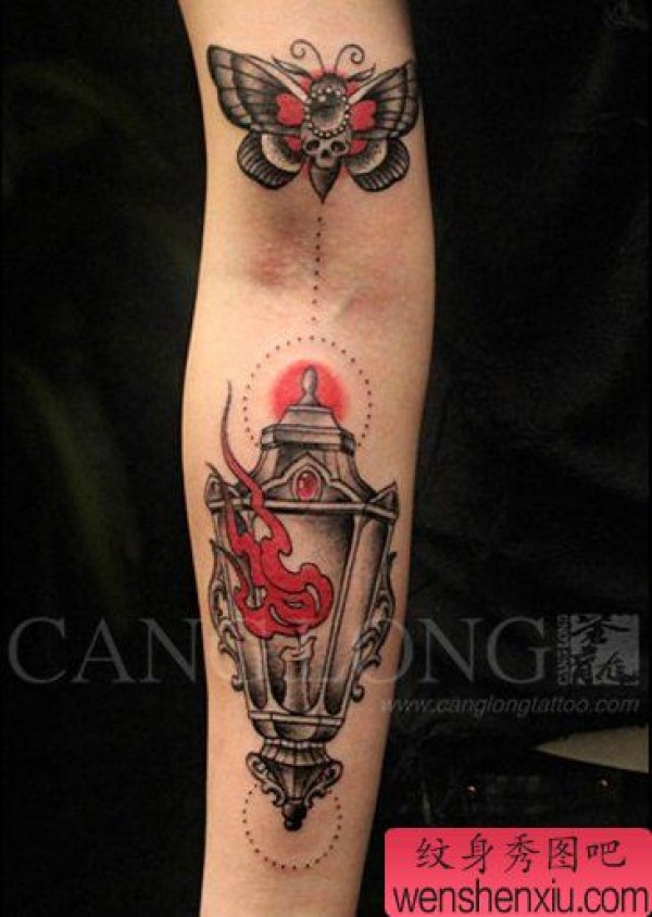 手臂一张时尚经典的灯与飞蛾纹身图案