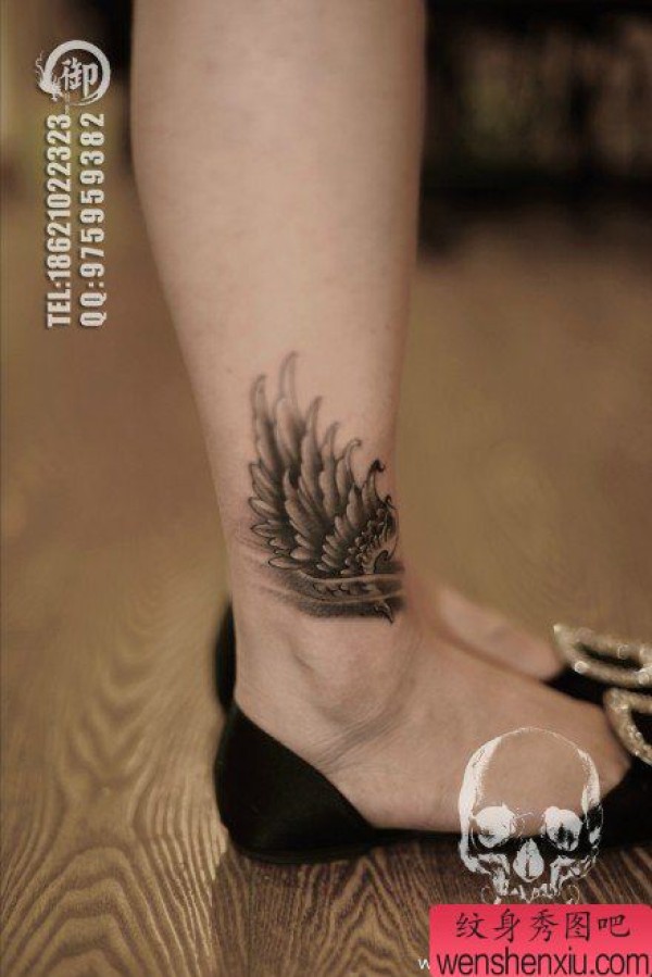 女生腿部时尚精美的黑白翅膀纹身图案