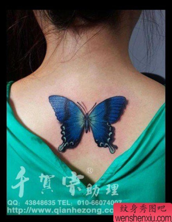 女生后背时尚唯美的彩色蝴蝶纹身图案