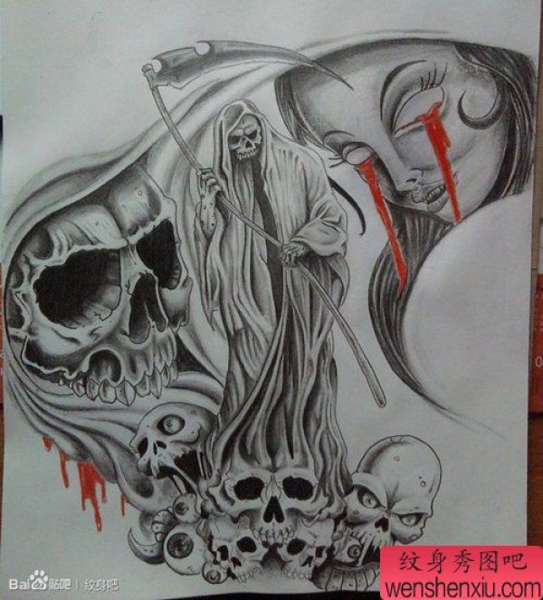 一张时尚很酷的黑白死神纹身手稿